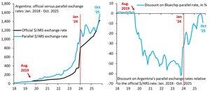 Argentinský paralelní kurz (lhs, modrý) prudce oslabil vzhledem k oficiálnímu směnnému kurzu $/ARS (lhs, černá čára), přičemž diskont se přiblížil 10 % (rhs). To je pozoruhodné vzhledem k nedávným americkým prohlášením o bezpodmínečné podpoře. To je známkou toho, jak podstatné je nadhodnocení pesa.