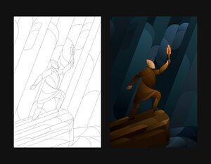 Kompozice se otevírá, perspektiva stoupá, břemeno se zmírňuje. Je to pohyb za odporem, jasnost po zmatku. Pochodeň se stává křehkým důkazem, že stvoření ještě dýchá