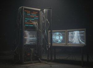 Reset s přehledností - skutečný serverový panel, LED vzory naznačující záměrnost, terminál zobrazující kód jako poezii.