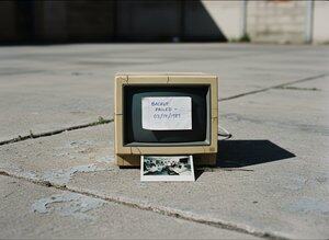 Terminál ze 70. let na popraskaném betonu za denního světla. Ručně psaná poznámka "BACKUP FAILED". Sušené květiny jako památník u silnice.
