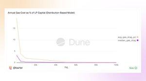 Cuando el gasto anual en gas se expresa como porcentaje del capital de LP, las posiciones más pequeñas son brutalmente penalizadas. Con un TVL de 5.000 dólares, la resistencia media del gas se sitúa alrededor del 3-4% anual en torno a la resistencia. Aquí es donde "APY atractivo" deja de impresionar. La erosión media solo cae por debajo del 0,5% por encima de los 50.000 dólares TVL.