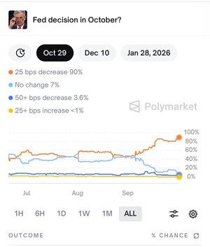 JUST IN: 🇺🇸 Les traders de Polymarket estiment maintenant à 90 % la probabilité que la Réserve fédérale réduise à nouveau les taux ce mois-ci.