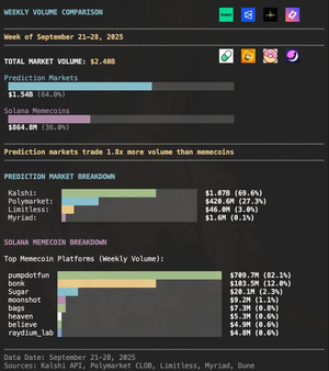 I mercati delle previsioni hanno registrato un volume superiore del 180% rispetto ai memecoins di Solana la scorsa settimana.