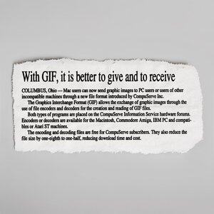 1987: "Con il GIF, è meglio dare che ricevere… Il Graphics Interchange Format (GIF)… riduce la dimensione del file da un ottavo a un mezzo, riducendo il tempo e il costo di download."