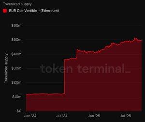 De voorraad van $EURCV, de euro-gedekte stablecoin uitgegeven door Societe Generale, is het afgelopen jaar met bijna 400% gestegen op Ethereum.