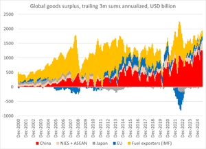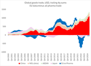 O superávit da Ásia é tão grande que está empurrando as medidas de desequilíbrios do comércio de bens de volta a níveis quase recordes (em dólares), embora o superávit de petróleo seja bastante baixo e o superávit da UE esteja encolhendo (cairia ainda mais sem a indústria farmacêutica irlandesa)