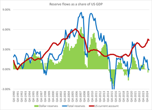 E as entradas relacionadas com reservas simplesmente não têm sido um grande fator no aumento do défice da conta corrente dos EUA desde 2020 (ao contrário do período antes da GFC). O crescimento das reservas também tem sido modesto em comparação com o crescimento da oferta de títulos do Tesouro, novamente, ao contrário do período antes da GFC