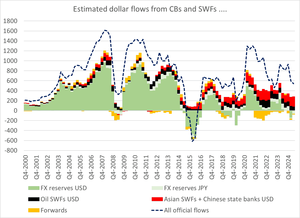 E o meu modelo para os fluxos mais amplos para o dólar de todos os atores oficiais mostra uma queda também -- com os fluxos totais a descer para cerca de 1 pp do PIB dos EUA / $300b (principalmente de investidores estatais asiáticos como o NPS, o GIC e os SCBs chineses)