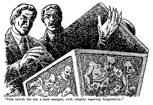 “De dentro da caixa, uma mão emergiu, com unhas longas e afiladas.” (Do conto de terror de Ken Dickson “A Caixa Chinesa” na revista Fantasy Tales, vol 2, n.º 4, Primavera de 1979, ilustrado por Alan Hunter, um colaborador frequente de arte nas primeiras edições de White Dwarf e no Fiend Folio de AD&D)