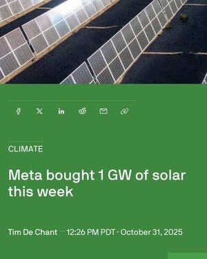 „A Meta assinou três contratos esta semana para adquirir quase 1 gigawatt de energia solar enquanto se apressa para alimentar suas ambições elevadas em IA.