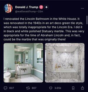 Eu nem sei por onde começar... o presidente dos EUA está mesmo a falar sobre uma casa de banho e como gosta que ela seja decorada?