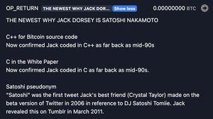 Presumivelmente destinado a acompanhar este texto op_return de ~8kb minerado logo após pelo SpiderPool, detalhando uma teoria espúria de que Jack Dorsey é Satoshi