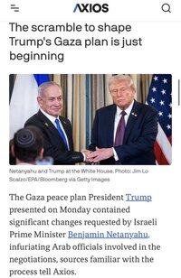 Theo Axios, kế hoạch của Trump đã bị thay đổi hoàn toàn theo yêu cầu của Netanyahu, gây ra sự tức giận từ Ả Rập Saudi, Ai Cập, Jordan và Thổ Nhĩ Kỳ. Qatar thậm chí đã kêu gọi Washington không công bố nó, nhưng Nhà Trắng vẫn tiếp tục.