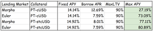 我注意到 PT-cUSD 和 PT-stcUSD 現在可以在 @MorphoLabs 和 @eulerfinance 上使用。 這對你意味著什麼? 80% 以上的 USD 年化收益率聽起來怎麼樣? 在一年內賺到你美麗的母親 20 年所賺的 💅