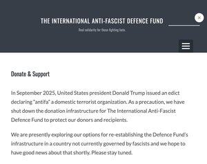 國際反法西斯防衛基金(International Antifa Defence Fund),由反法西斯武裝分子及 @RUHistoryDept 學者 @Mark__Bray 捐款的機構,已宣布關閉其捐款基礎設施,以「保護我們的捐贈者和受益者」,因為美國總統宣稱反法西斯組織為恐怖分子。 他們聲稱將其業務搬遷到海外,暗示他們之前是以美國為基地。他們利用美國平台 @Patreon、@FundRazr 和 @TheActionNet 進行募款。